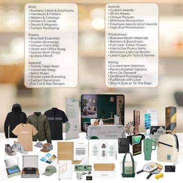 We offer a range of services to help businesses grow and succeed in promoting their brand internally and externally, including all forms of print, a wide range of promo items and basic to fully custom cut and sew apparel. Our services are tailored to each clients specific needs and goals, ensuring the best possible outcomes. We’ve got your branding covered from everyday print and promo to custom apparel and uniforms, merch drops, and recognition awards ... in addition to employee handouts, kitted client gifts, event displays and giveaways! We make it all happen, seamlessly and on brand. We think outside the box, and will work hard to provide quick options as well as items that are fully custom with long lasting impressions!